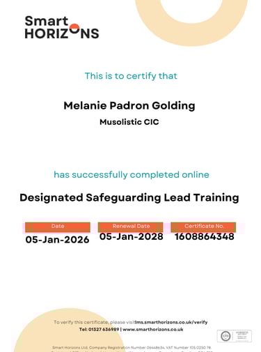 I have completed Designated Safeguarding Lead (DSL) training, strengthening my ability to work safely, ethically, and responsibly with children and young people. This training supports my work across community settings and therapeutic practice, ensuring safeguarding is embedded in all aspects of Meltopia Therapy.